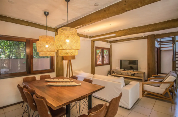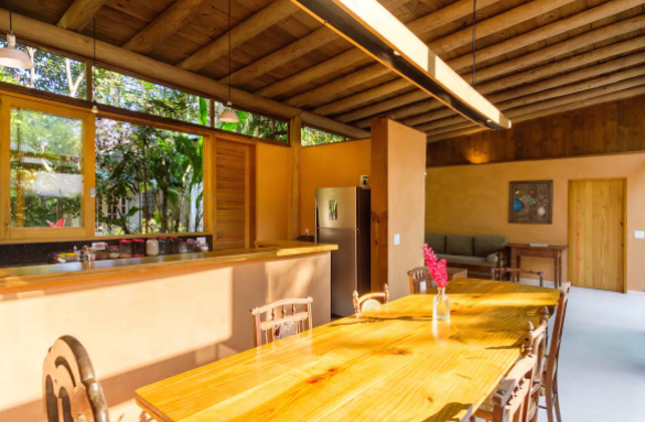 Esta casa possui três quartos, dois com cama queen size e um com cama de casal, além de disponibilizar uma cama de solteiro e colchões extras. Na área externa há uma piscina e bastante natureza. A propriedade fica a uma quadra da praia de Itamambuca, em um condomínio fechado. O preço médio da diária é de R$1.159,00.