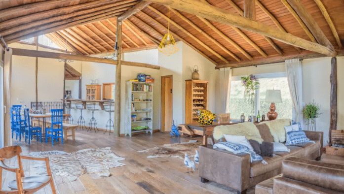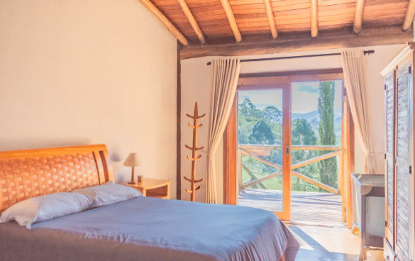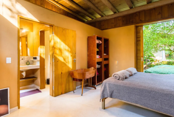 Esta casa possui 5 quartos e acomoda até 11 hóspedes. O sítio fica dentro de uma reserva natural com cachoeiras e muita natureza. Na propriedade há outras 4 casas, porém elas são distantes, o que garante a privacidade. Vários comentários positivos dos hóspedes, nota 4,93 no AIRBNB. Preço médio da diária R$1.325,00.