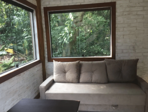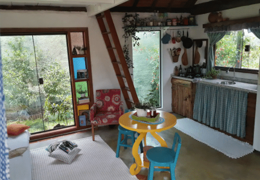 Esta pequena casa tem todos os ambientes interligados e é indicada para casais. Possui uma cama de casal e um sofá cama. Na área externa você pode aproveitar uma banheira ao redor da natureza. A propriedade fica próxima ao centro da cidade e há cachoeiras nas redondezas. Preço médio da diária R$267.