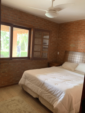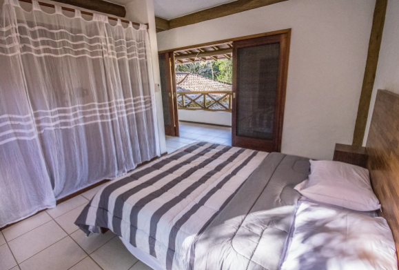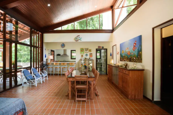 Esta casa possui quatro suítes e acomoda até 10 pessoas. Um quarto possui cama queen size, outro possui cama de casal e os demais camas de solteiro. Ela possui piscina, churrasqueira e fica a poucos metros do mar. Nota 5,0 no AIRBNB. Diária média de R$1.143,00.